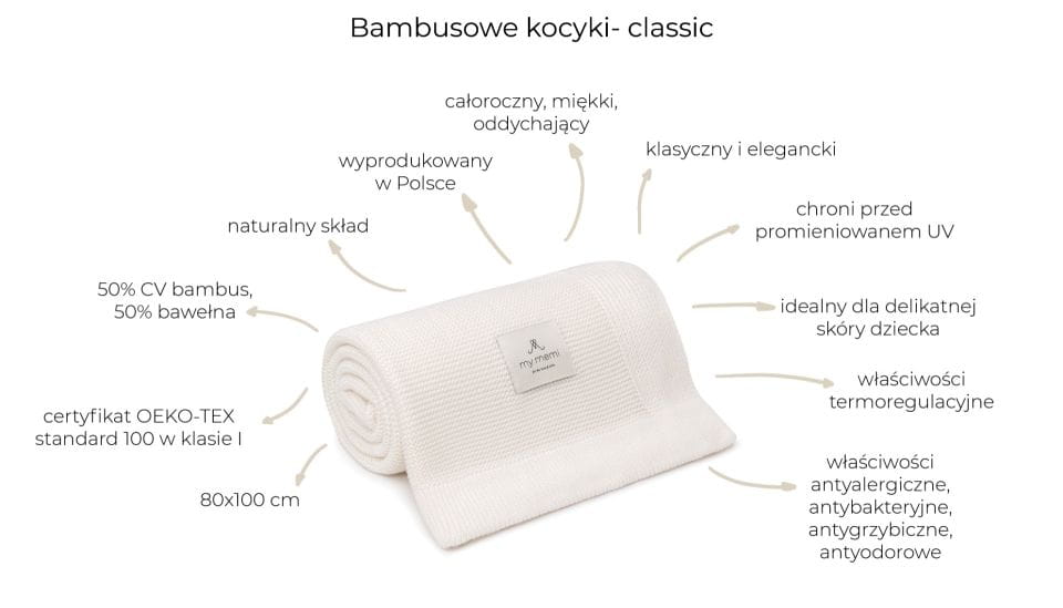Całoroczny, miękki i oddychający kocyk w minimalistycznym, skandynawskim stylu. Dziany w całości w Polsce z certyfikowanej przędzy bambusowej z dodatkiem bawełny. Idealny dla skóry dziecka- pochłania wilgoć i utrzymuje ją z daleka od skóry, posiada właściwości termoregulacyjne- utrzymuje komfort cieplny, zapobiega przegrzewaniu. Chroni przed promieniami UV.