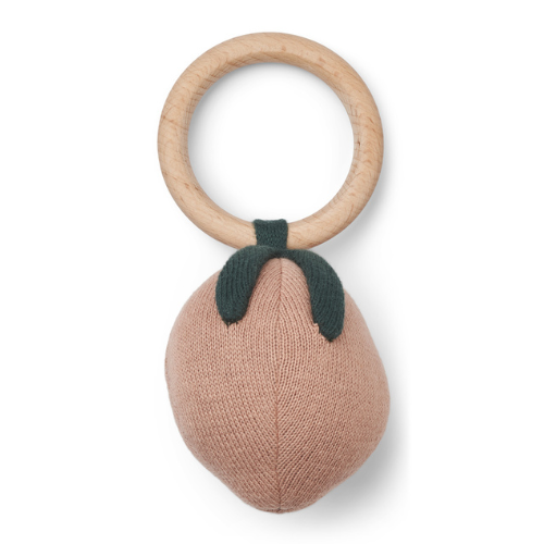 Grzechotka o wzorze brzoskwini Aria to idealna zabawka dotykowa dla ciekawskich małych dzieci. Wykonany z miękkiej dzianiny organicznej bawełny z kółkiem z drewna bukowego i małym dzwoneczkiem w środku, który pobudza małe uszka. Grzechotka zapewnia dobry chwyt nawet najmniejszej dłoni i może być również przymocowana do łóżeczka lub drewnianych pałąków.