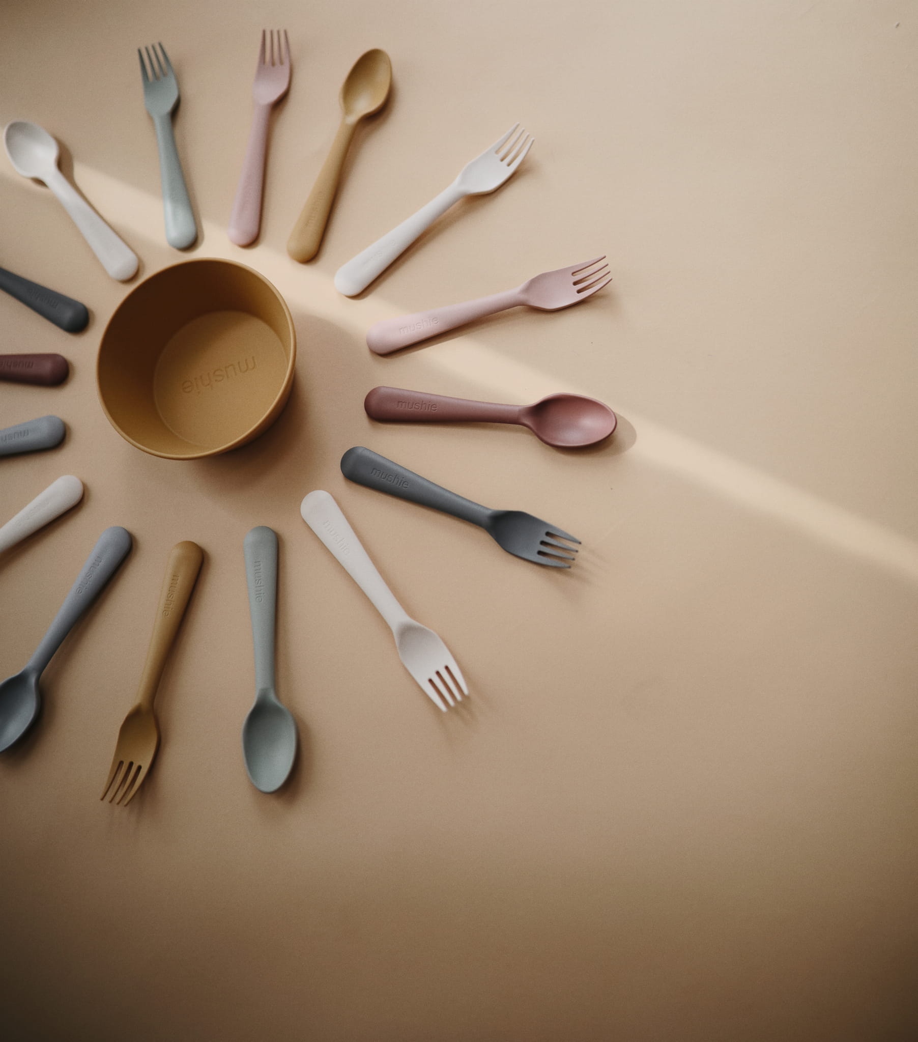 Rozpocznij wprowadzanie pokarmów stałych do diety Twojego dziecka, z pomocą zestawu łyżeczki i widelca Mushie!
