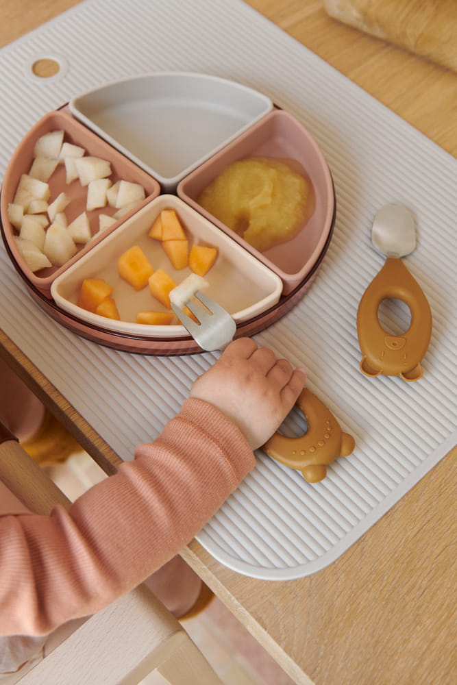 Talerzyk z przegródkami od marki Liewood dla dzieci zachęci maluchy do jedzenia. Silikonowy talerzyk rozdziela jedzenie na cztery tacki, pozwalając dziecku mieszać do woli. Dodatkowo można używać osobno talerzyka bez przegródek, który znajduje się pod przegródkami.