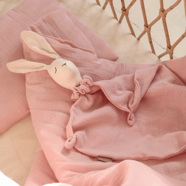Kocyk przytulanka to wyjątkowa zabawka, która posłużyć może zarówno jako miękki, delikatny i bezpieczny dla najmłodszych kocyk, jak i uroczy pluszak o podobiźnie sympatycznego króliczka. Wyjątkowy nadruk, utrzymany w minimalistycznym stylu i stonowanych barwach, zawiera subtelne elementy roślinne, wprost idealne dla małego ogrodnika. Wzór znajdujący się na cudownie miękkiej, muślinowej tkaninie został zaprojektowany specjalnie dla marki Sei Mia, dzięki czemu jest całkowicie unikatowy i niepowtarzalny.